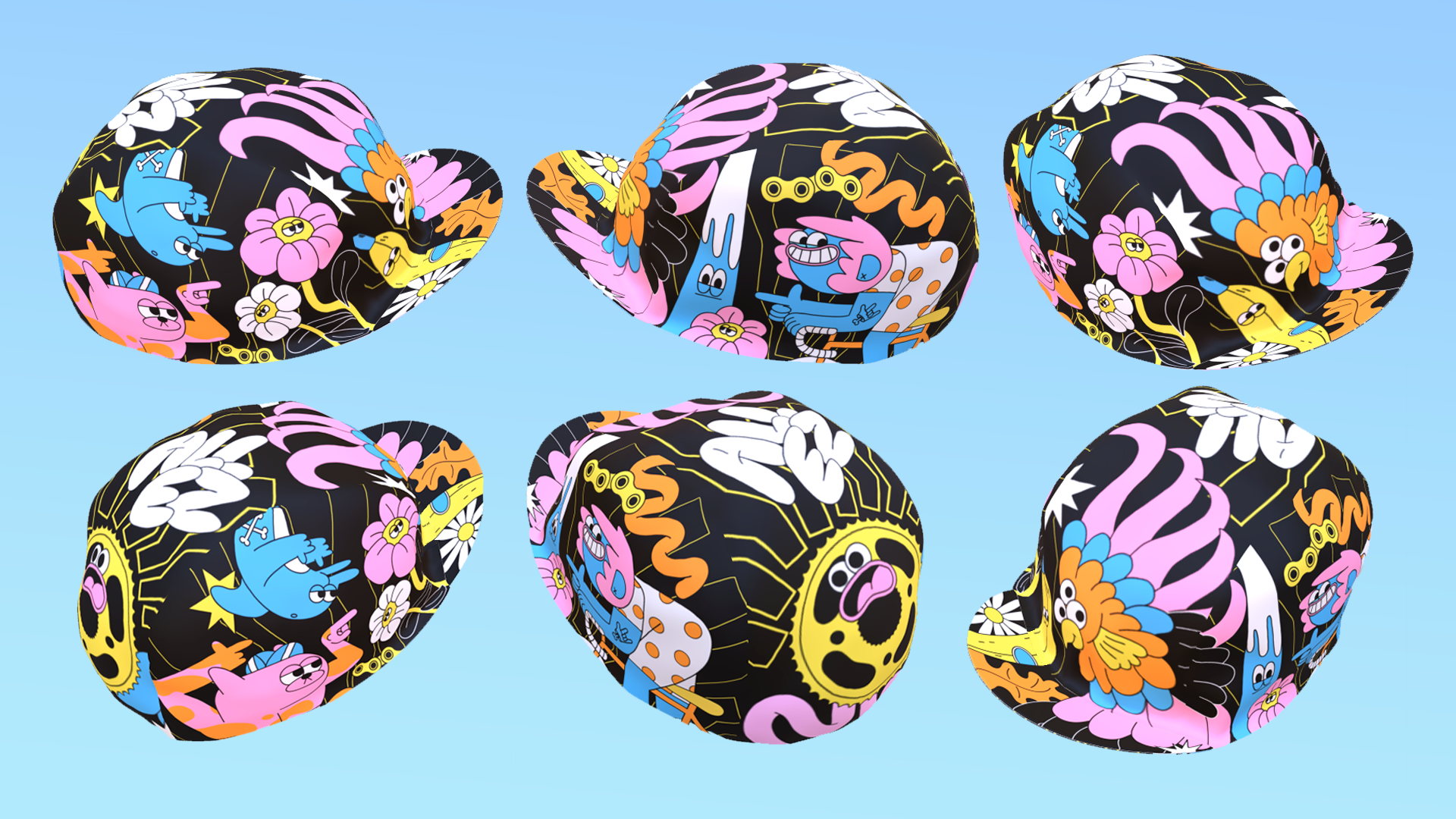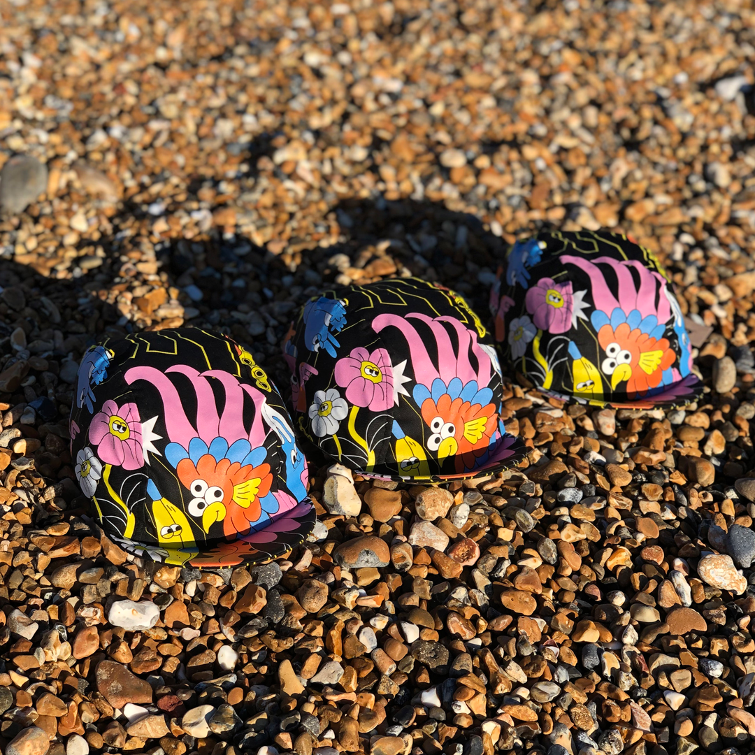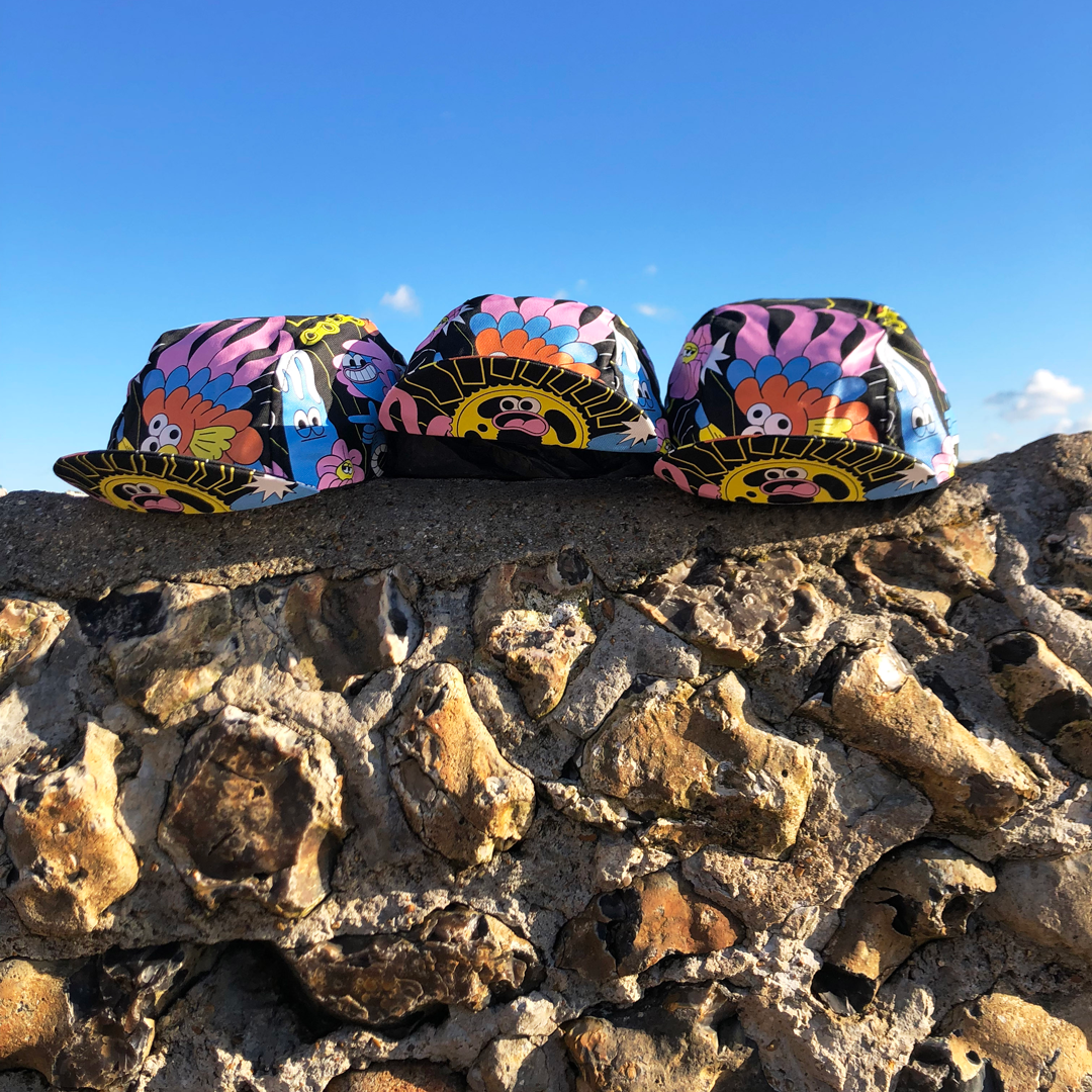 New cycling cap and musette design for Bello! Designed with a carefully chosen limited palette so the colours really pop on the black fabric. The design features a bright sunshine in the shape of a bike cog, little bit of bubble hand drawn type spelling out "Allez!" and 3 eyed parrot. The print also features a polka dot cyclist, inspired by the amazing cyclists on the 'Tour de Femmes' this year. What a climb the Alpe d'Huez is, wow!