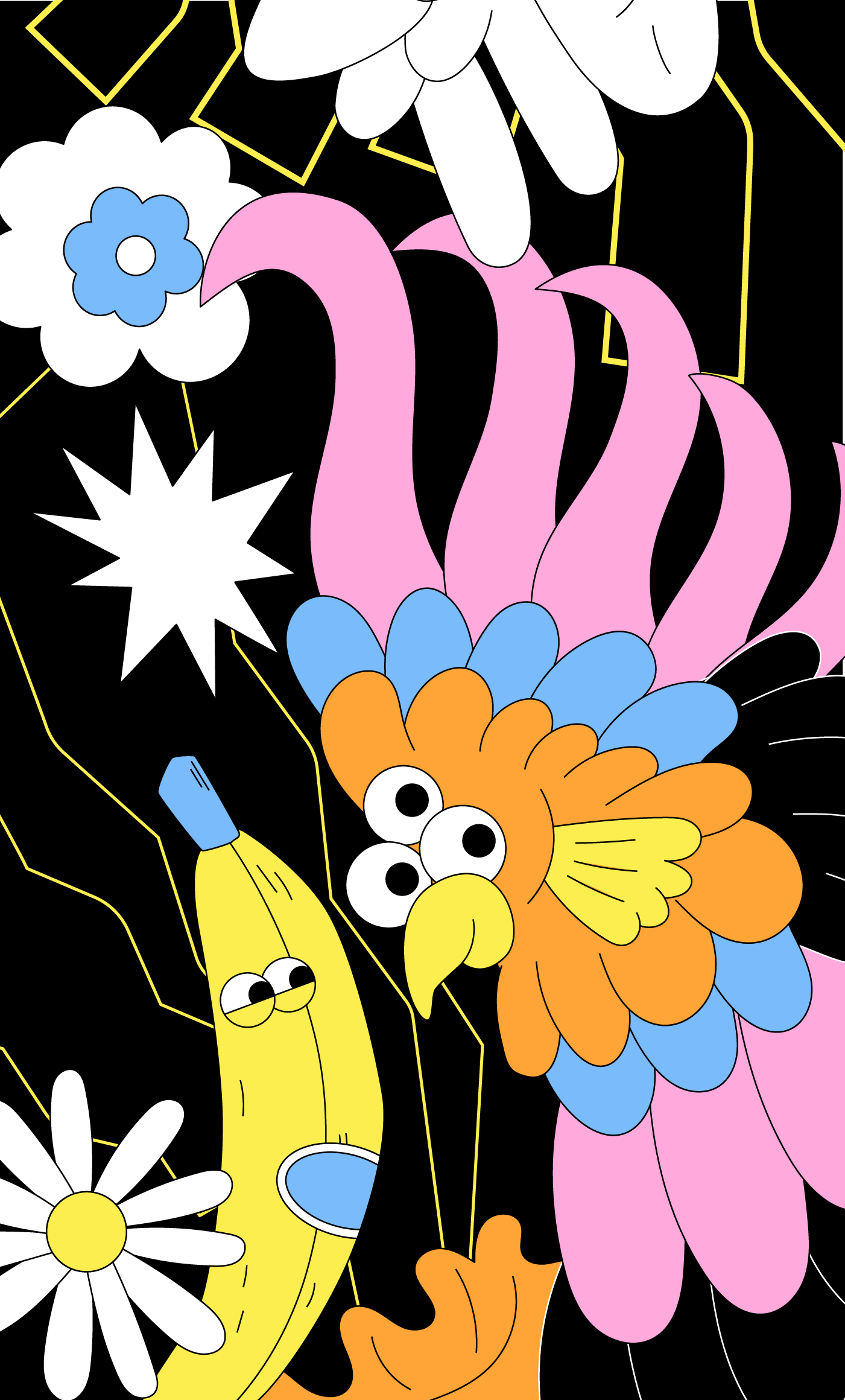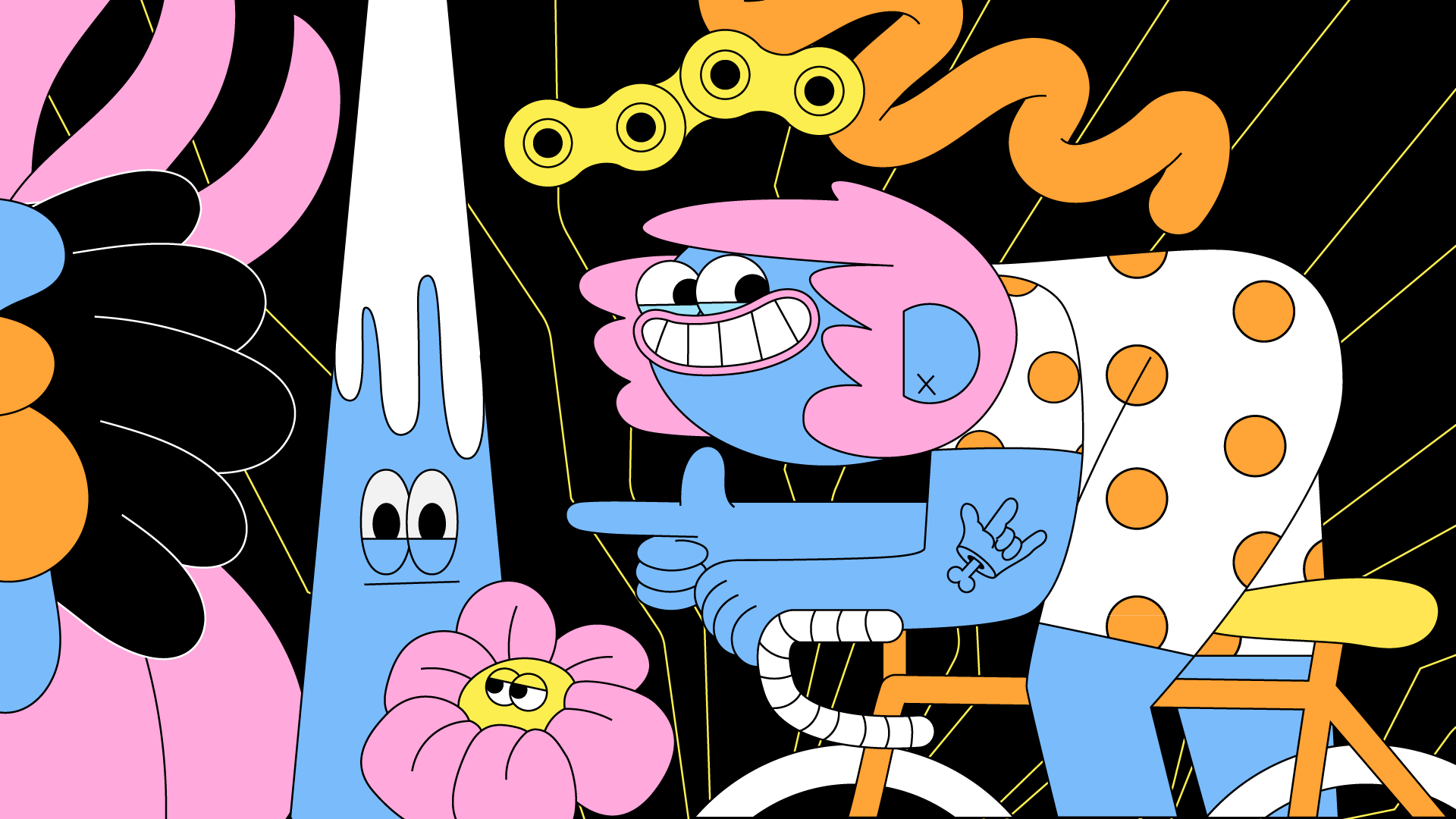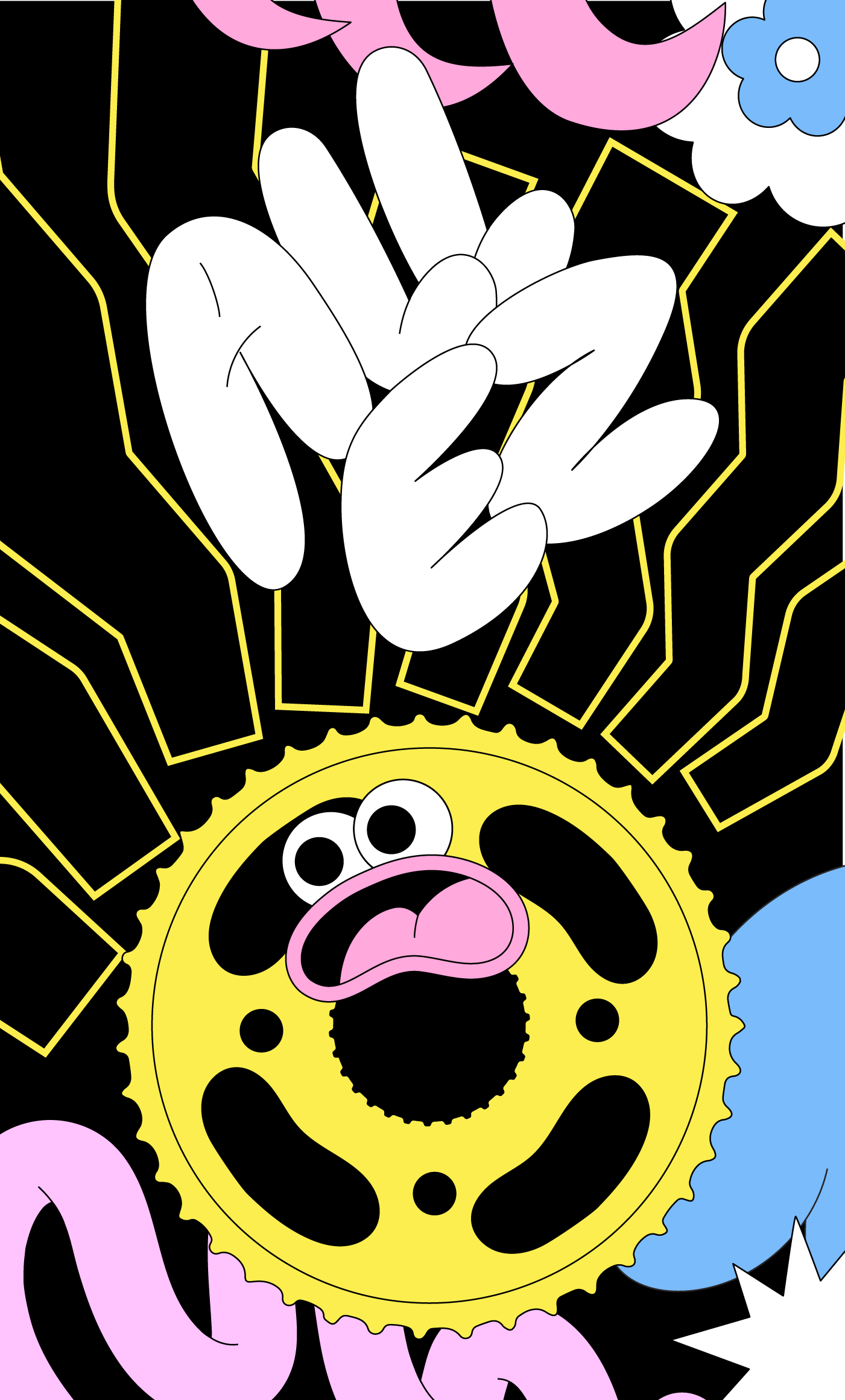 New cycling cap and musette design for Bello! Designed with a carefully chosen limited palette so the colours really pop on the black fabric. The design features a bright sunshine in the shape of a bike cog, little bit of bubble hand drawn type spelling out "Allez!" and 3 eyed parrot. The print also features a polka dot cyclist, inspired by the amazing cyclists on the 'Tour de Femmes' this year. What a climb the Alpe d'Huez is, wow!