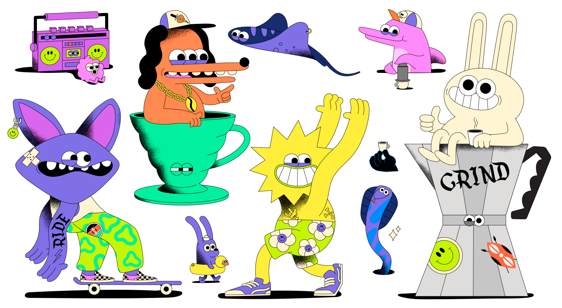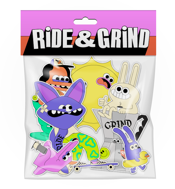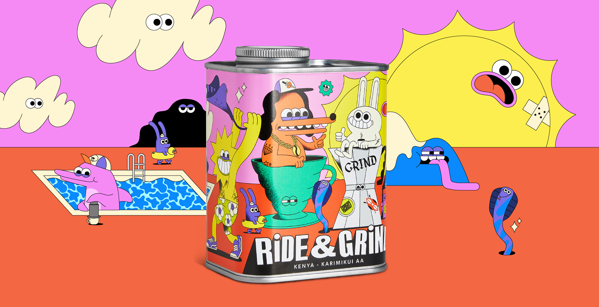 Ride & Grind gave me a very open brief to create some fun packaging for their latest tin. The packaging features, flying manta ray's, a wired rabbit, aeropress dolphin and skateboarding bat, to name but a few.