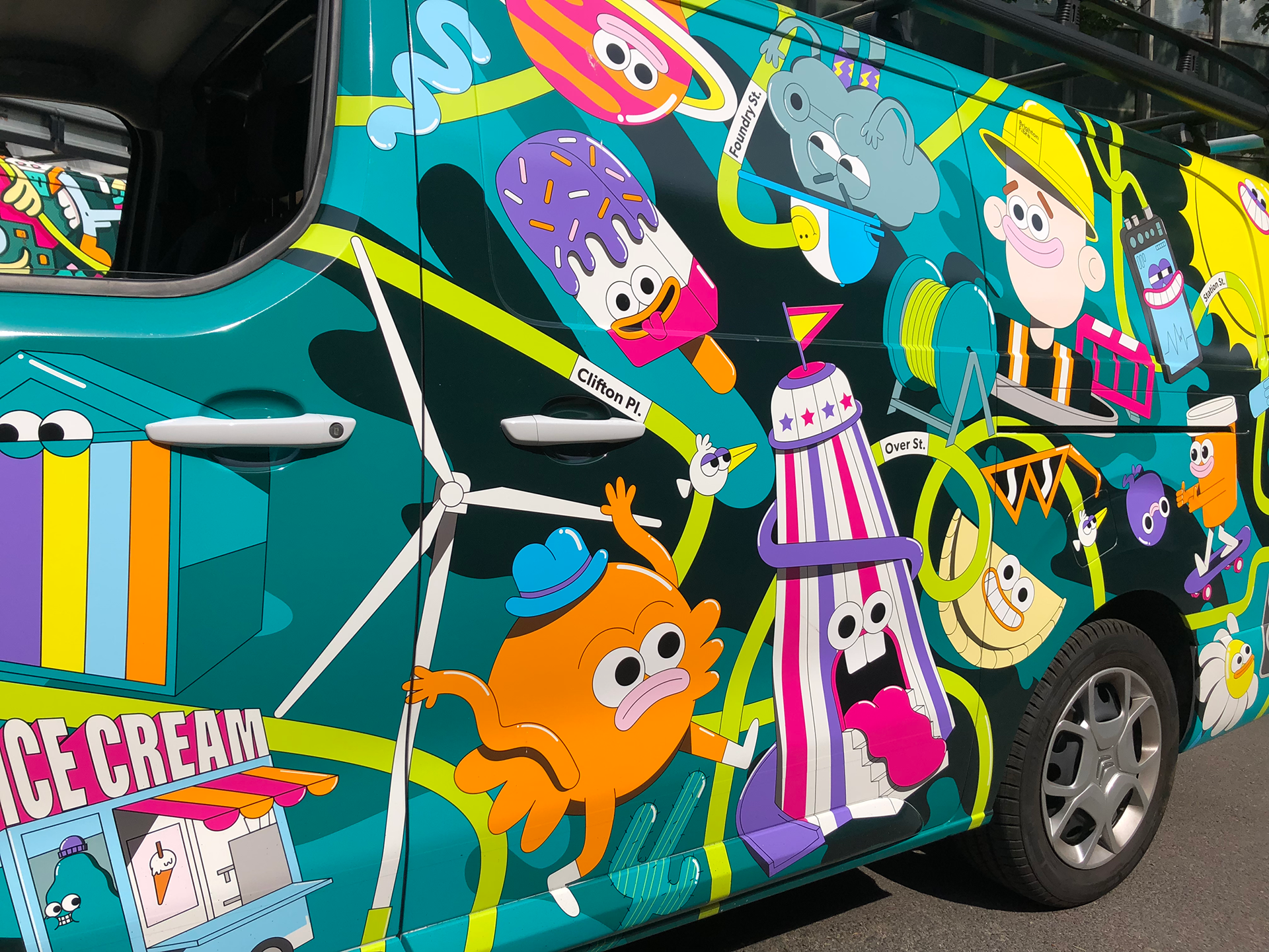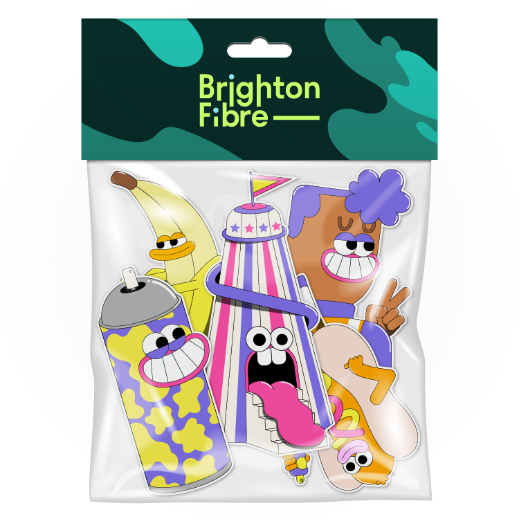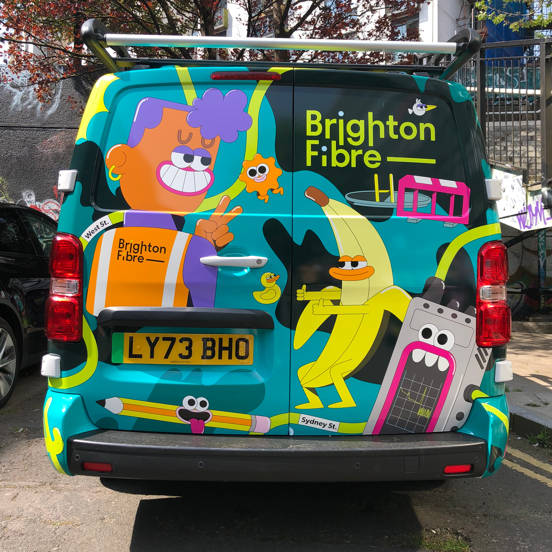 I was approached by the team at Brighton Fibre to create a bunch of illustrations to boost their branding and wrap around their newest street team van. I developed over 50 characters all with a Brighton and Hove focus including the i360, a fairground helter skelter and carousel horse, seagulls, dolphins, spraycan's and dancing hotdogs.
